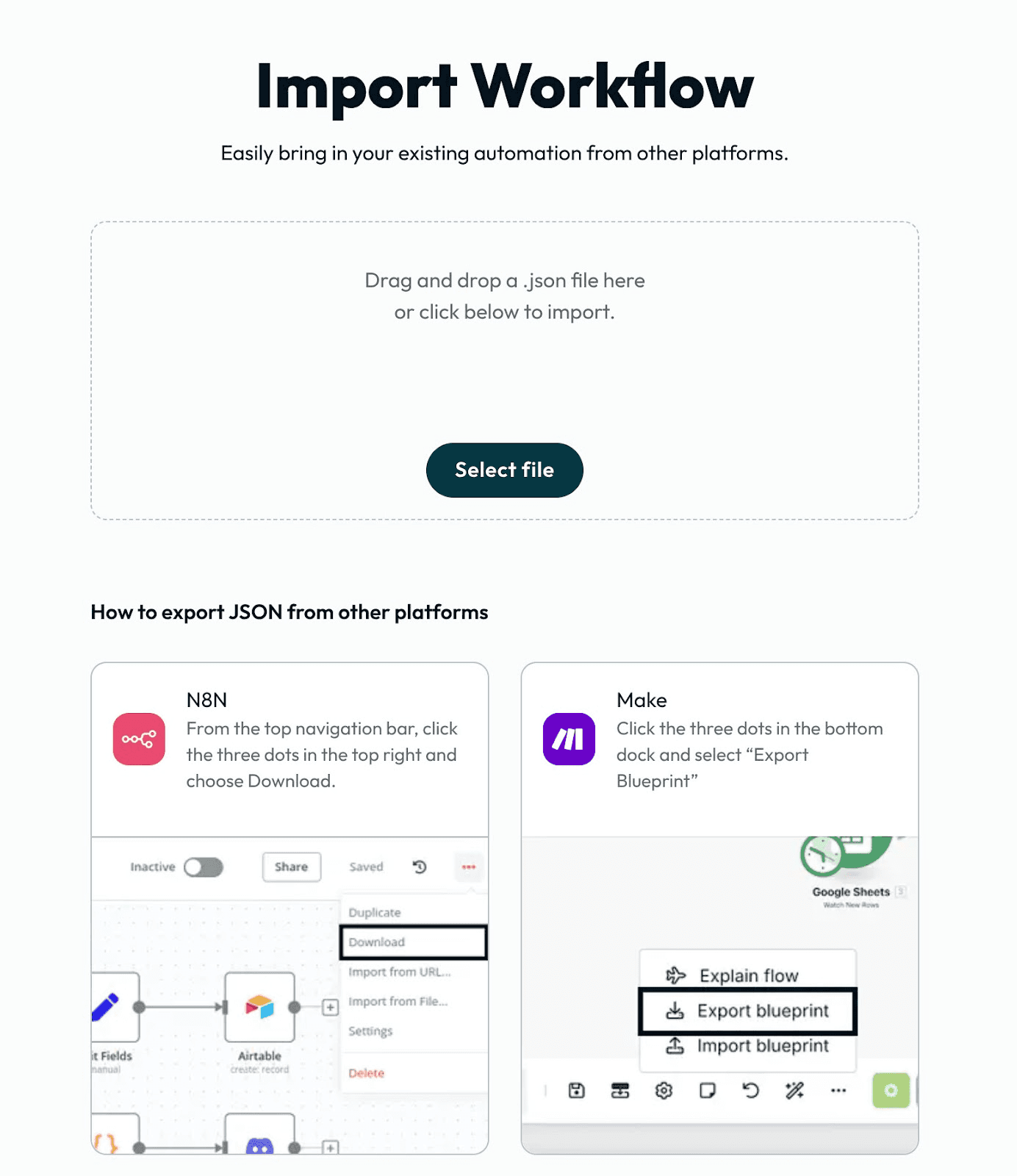 2. Upload to doFlo: Log in to your doFlo account, navigate to the "Import Workflow" section and simply drag and drop or select the JSON file you just downloaded.