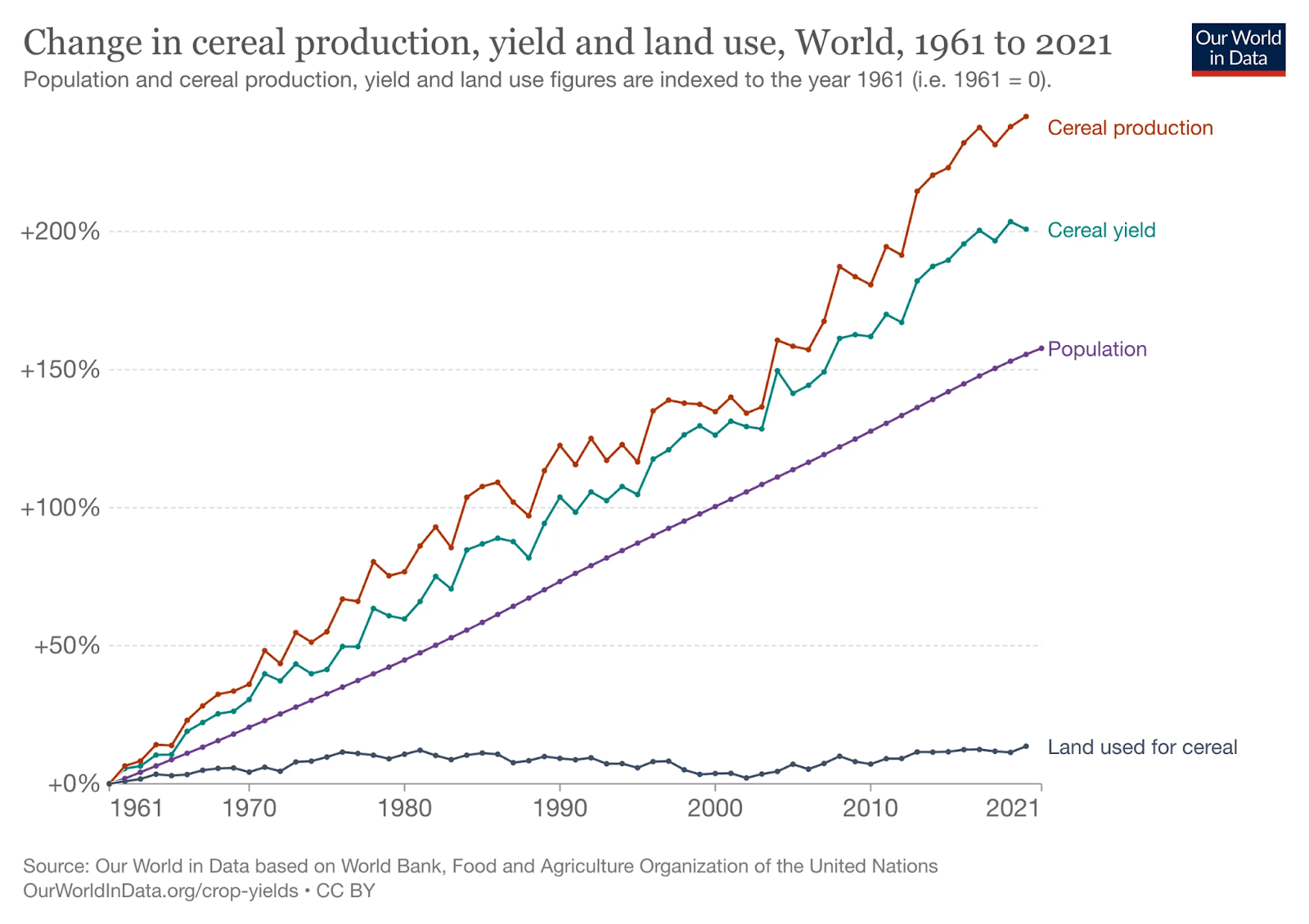 The above United Nations data tracks the progress of the Green Revolution since 1961, showing that as the world population continued to grow by about 50% every generation, the production of cereal grains kept pace, and exceeded this rise, while the overall use of land for cereal production remained almost unchanged.