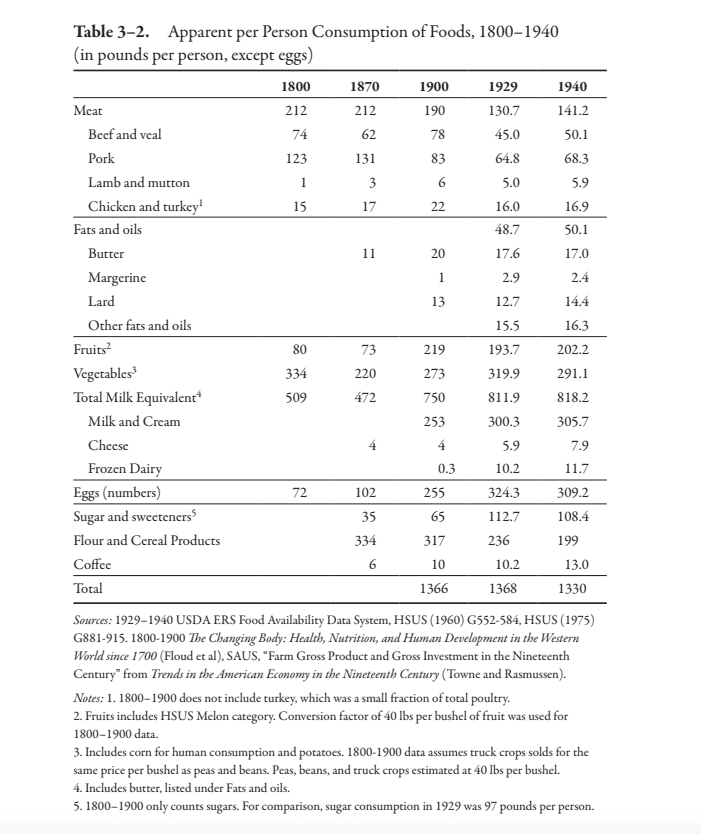 As food production was automated, the typical diet in the developed world changed to reflect the easy availability of different foods. Here is a useful table from Gordon’s book: