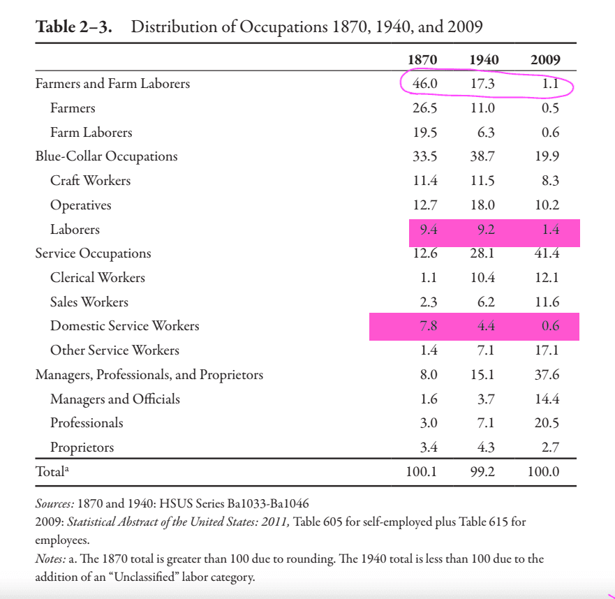 Circled is the decline in farm laborers as a percentage of the American population between 1870 and 2009 (the most recent census data when the book was published in 2016). Farming alone went from the leading employer of people in America, one of the world’s most agrarian societies at the time, to employing statistically almost nobody. Meanwhile crop yields and productivity exploded, despite about 98% of agricultural jobs disappearing.