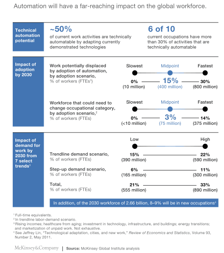 Automation has been the watchword of our technology culture for the past so many years. The McKinsey Global Institute estimates that up to half of the total “work” that the economy now performs could be fully automated in the near future.
